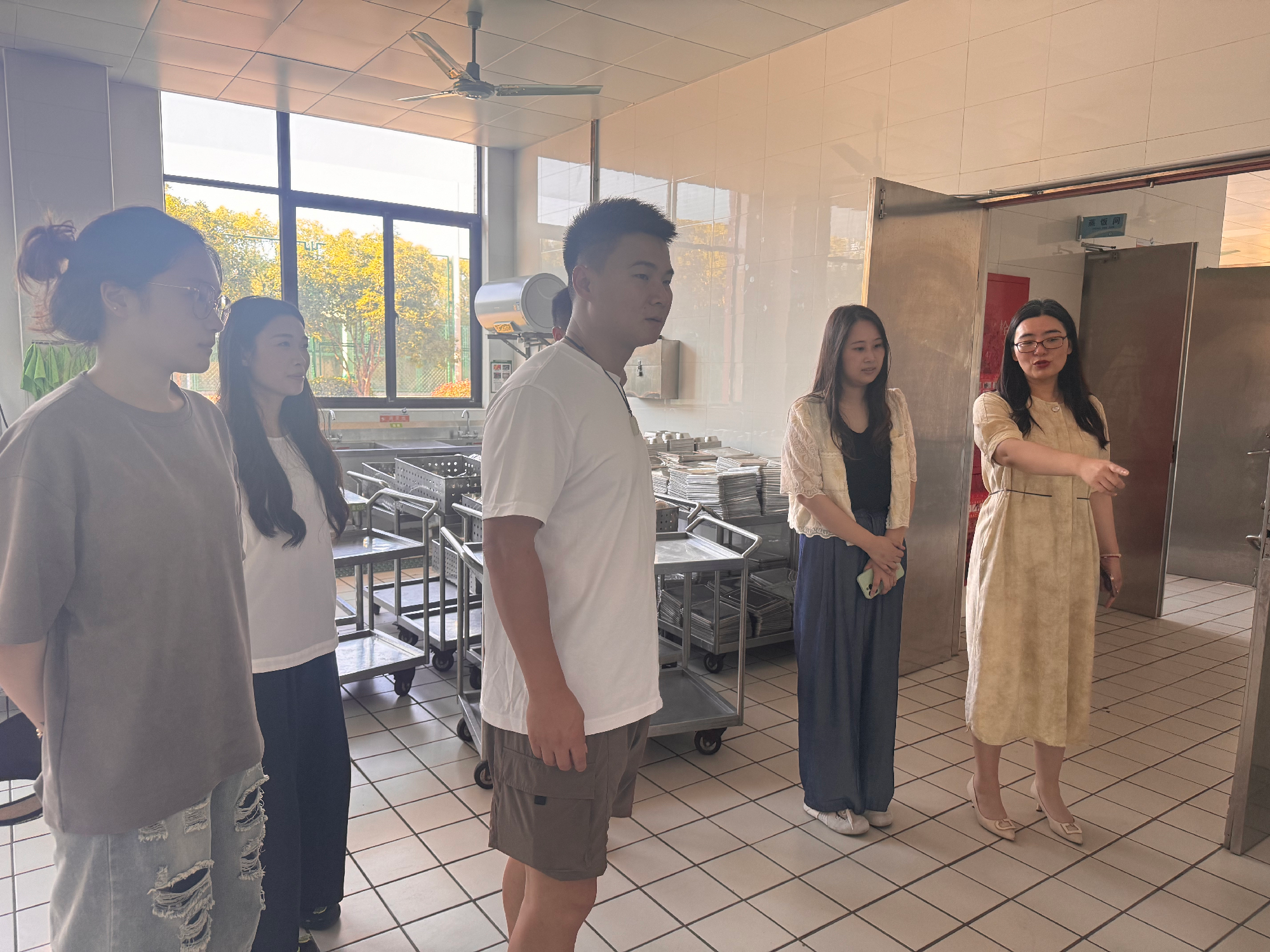 在食堂检查环节,食品安全管理领导小组成员一行深入食品仓库,重点核查原料采购台账、供应商资质及食材保质期,确保每一批食材 “来源可溯、去向可追”;随后走进粗加工间,细致检查食材清洗切配流程与环境卫生,针对刀具分类存放、生熟分区操作等细节提出优化建议。食堂运营方 “上海绿捷实业发展有限公司” 现场经理全程陪同,汇报标准化作业与人员健康管理情况,检查组对 “明厨亮灶”、分间责任到人、色标管理等举措给予肯定,并就食材储存、烧制细节提出改进意见。