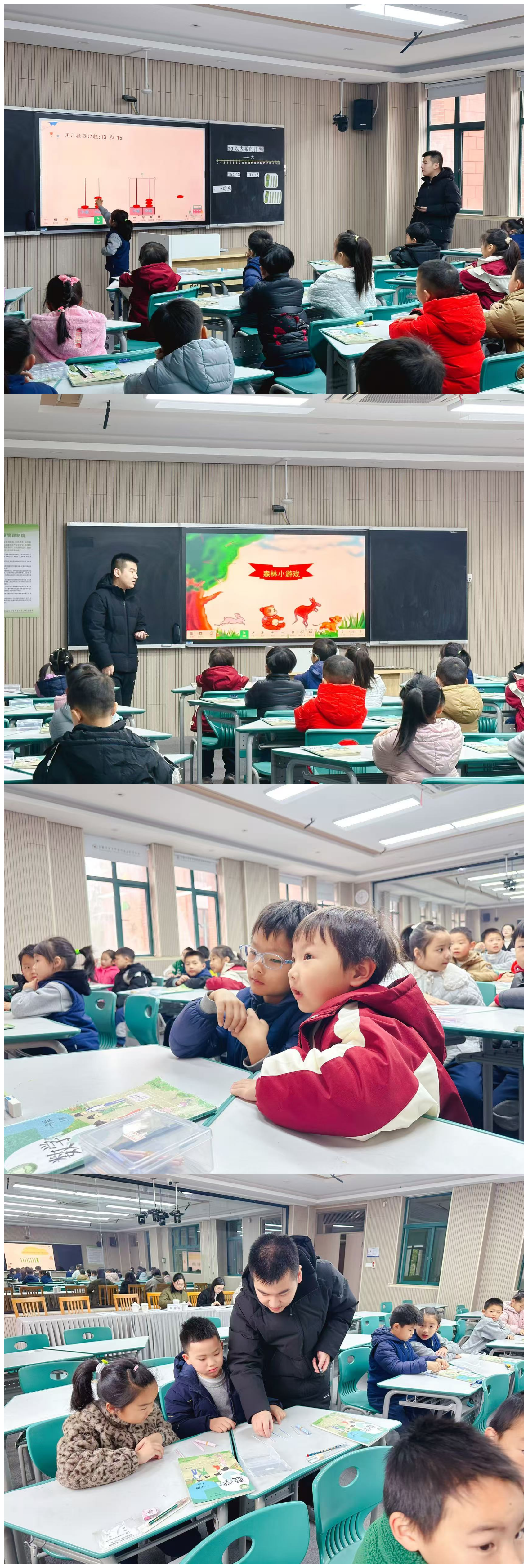 周阳老师执教的一年级《20 以内数的排列》,以 “森林小动物跳远” 趣味情境导入,自然引出 “数线” 工具,唤醒学生对 10 以内数序的认知。课堂上,通过小熊 1 格 1 格数、小兔 2 格 2 格数(感知单双数)、袋鼠 5 格 5 格数的分层活动,引导学生在动态体验中感知 20 以内数的排列规律,突破 “数与点一一对应” 的教学难点。在数的大小比较环节,从基础的 3 和 5 比较,到进阶的 13 和 5、13 和 15 比较,逐步拓展数序、数的组成、计数器、数位等多种比较方法,兼顾知识落实与思维训练。