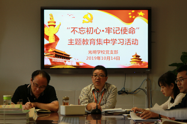 (光明学校通讯员 李娟/文 陈珠/摄)10月15日中午,光明学校在会议室开展“不忘初心、牢记使命”主题教育第二次集中学习研讨活动。书记高卫忠主持活动,党小组长高晓静主讲,全体党员参加学习。